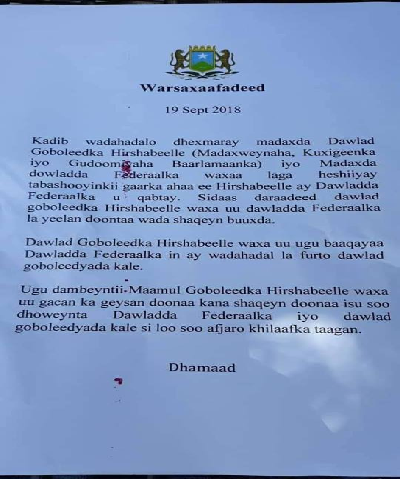 Dowald goboleedka Hirshabeele ayaa war qoraal ah oo ay soo saareen ku sheegay inay Dowladda dhexe ee Soomaaliya ay kala heshiiyeen arrimihii ay ka tabanayeen iyagoo sidoo kalena ugu baaqay Dowlad goboleedyadda kale inay talabadaas oo kale qaadaan.