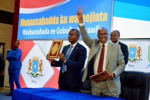 Guddoomiyaha gobalka Banaadir Cumar Maxamuud Maxamed Filish iyo sii hayaha Wasiirka waxbarashada Soomaaliya Cabdullaahi Goodax Barre, ayaa