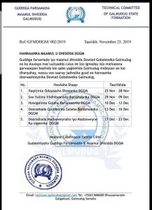 Dhuusamareeb – Guddiga Farsamada iyo Maamul u dhisida dowlad Goboleedka Galmudug ayaa shaaciyay jadwalka waqtiga la qabanayo soo xulista Xildhibaannadda maamulka Galmudug iyo Guddoonka Baarlamaanka.
