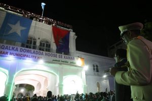 Dhanka kale, Madaxweyne Maxamed Cabdullaahi Farmaajo oo salaan sharaf ay siinayaan cutubyo ka tirsan Ciidanka Xoogga Dalka, baambaydunu ay ku maamuusayso heesta Calanka ayaa calan-saaray Aqalka Dowladda Hoose ee Xamar, halkaas oo ay munaasabaddu ku qabsoontay.