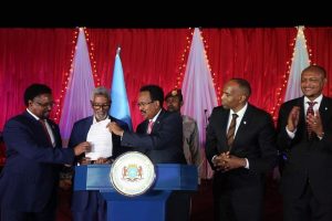 Madaxweynaha oo ka qaybgalayay xaflad lagu soo xirayay kalfadhiga lixaad ee Baarlamaanka Soomaaliya ayaa saxiixay Sharciga Doorashooyinka oo in muddo ah horyaallay.