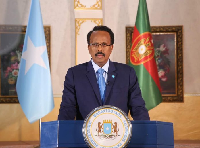 Madaxweynaha Soomaaliya Maxamed Cabdullahi Farmaajo oo Hambalyo ku aadan sanad Guurada 60-aad ee aasaaska ciidanka xoogga dalka u diray. Sawirka: Villa Somalia