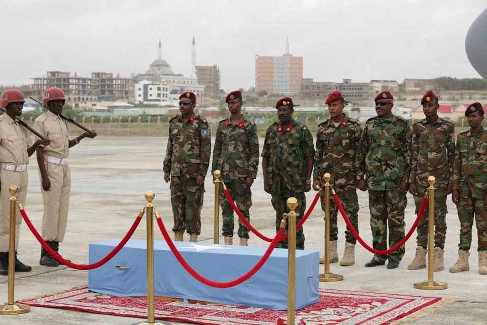 Diyaaraddii sidday marxuumka ayaa markii ay soo caga dhigatay garoonka waxaa naxashkii uu saarnaa la huwiyey Calanka Jamhuuriyadda Soomaaliya. Diyaaradda ayaa waxaa kale oo la socday xubno ka mid ah qoyska marxuumka.