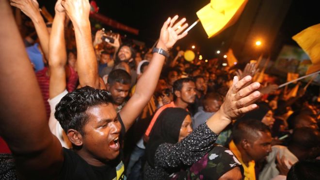 Taageerayaasha hogaamiyaha mucaraadka ayaa waddooyinka isugu soo baxo si ay ugu dabbaaldagaan guusha mucaraadku ka gaaray doorashada madaxtinimada Maldives.