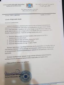 Guddigaan oo laga xusay warqad uu maanta soo saaray ra`iisul wasaare Kheyre ayaa waxa ay kala yihiin: