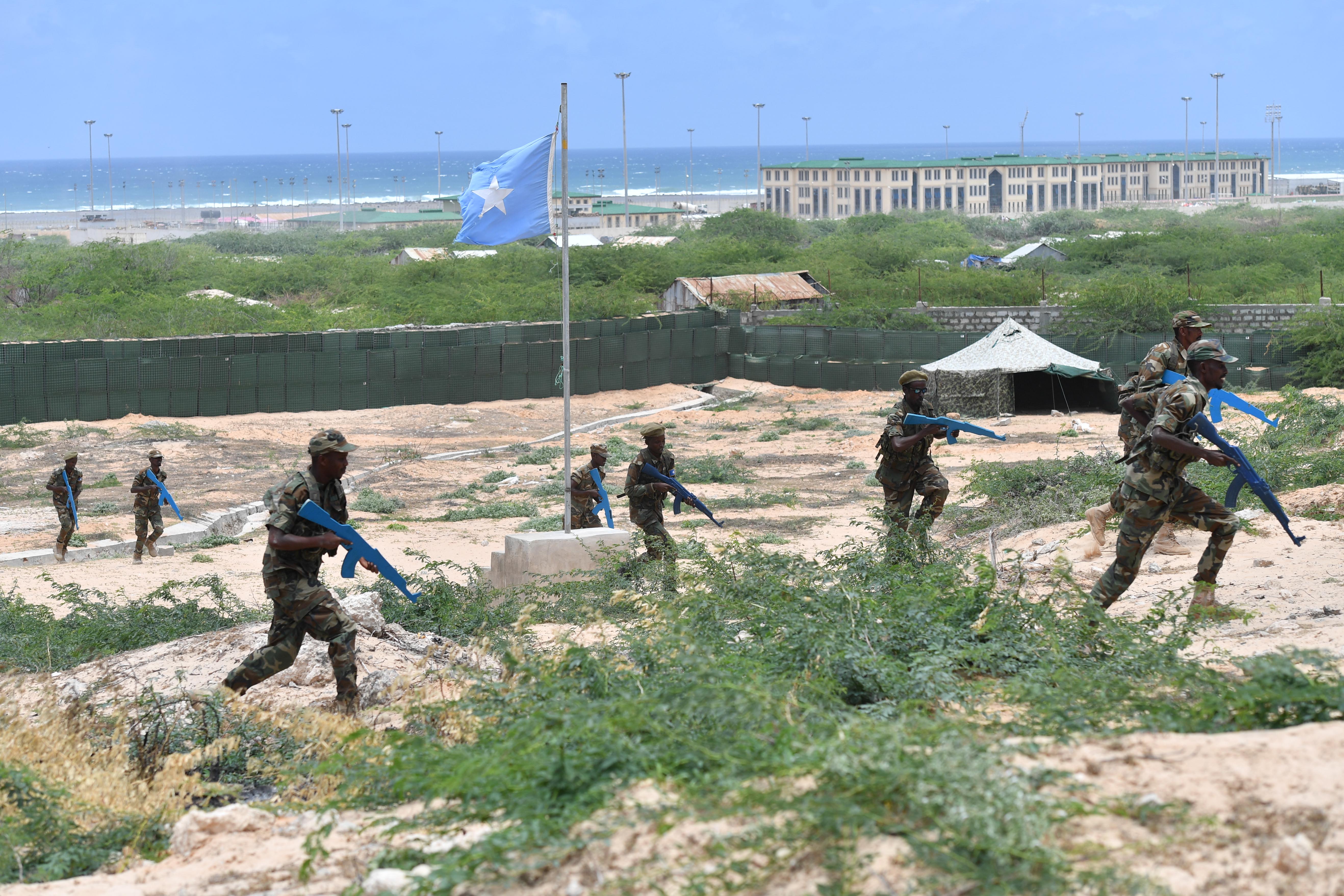 Somali National Army (SNA) soldiers demonstrate field military tactics during a pass-out ceremony to mark the end of a light infantry training course conducted by the European Union Training Mission in Somalia (EUTM) at the General Dhegabadan Training Camp (Jazeera) in Mogadishu, Somalia on September 10, 2017. AMISOM Photo / Omar Abdisalan