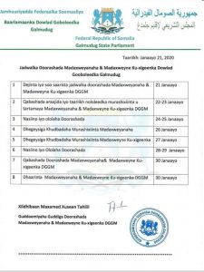 Waxaa sidoo kale la shaaciyay maanta jadwalka Doorshada Madaxweynaha Galmudug iyo ku xigeenkiisa. Araajida iyo taarikh nololkeeda musharaxiinta u tartamaya xilka Madaxweynaha Galmudug ayaa loo qorsheeyay 22-23 Janaayo iyadoo 27 laga dhigay dhageysiga Khudbadda musharaxiinta.