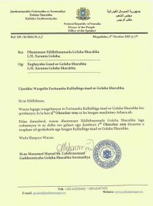Warqad uu soo saaray Guddoomiyaha Baarlamaanka Federaalka Soomaaliya Maxamed Mursal Sheikh Cabdiraxmaan ayaa lagu sheegay in kalfadhiga 6-aad ee Baarlamaanka Federalka si ramsi uu u furmi doono 9 bishaan Ocktoobar oo ku beegan maalin Arbaco ah.